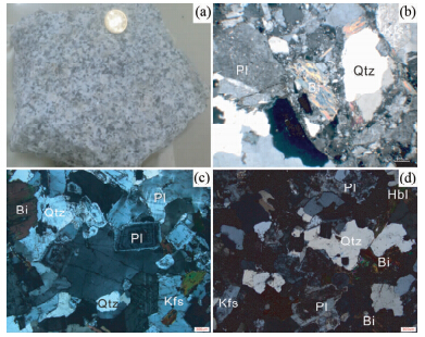 ![]() | 图 2 城安花岗闪长岩的野外(a)和显微(b)照片及旌德(c)和榔桥(d)岩体的显微照片Pl-斜长石;Kfs-钾长石;Qtz-石英;Bi-黑云母;Hbl-角闪石Fig. 2 Field photo(a) and photomicrograph(b)of the Chengan granodiorite, and photomicrograph of Jingde(c) and Langqiao(d)granodioritesPl-plagioclase; Kfs-potassic feldspar; Qtz-quartz; Bi-biotite; Hbl-hornblende |