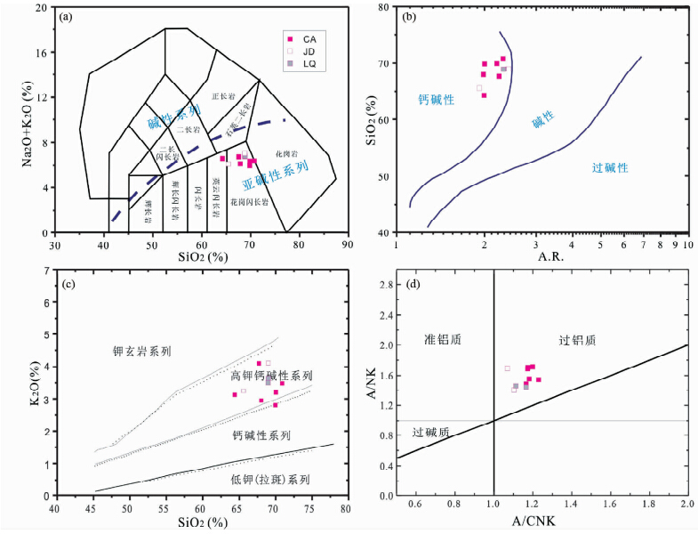 皖南花岗闪长岩样品SiO2含量变化范围在64.3%到70.8%,K2O含量为2.81%~4.12%,Na2O含量为2.66%~3.49%(表 2),全碱含量(Na2O+K2O)在5.97%~7.05%,均为花岗闪长岩类岩石(除1个样品外),里特曼指数σ=(K2O+Na2O)2/(SiO2-43)为1.33~2.06平均1.69,显示为亚碱性系列(图 3a),低A.R.值(1.98~2.42)[A.R.=(Al2O3+CaO+Na2O+K2O)/(Al2O3+CaO-Na2O-K2O)] 显示钙碱性特征(图 3b)。在SiO2-K2O图解中,所有样品均落在高钾钙碱性系列区域内(图 3c)。样品的A/CNK和A/NK值范围分别变化在1.07~1.23和1.40~1.71,属于过铝质岩石(图 3d)。