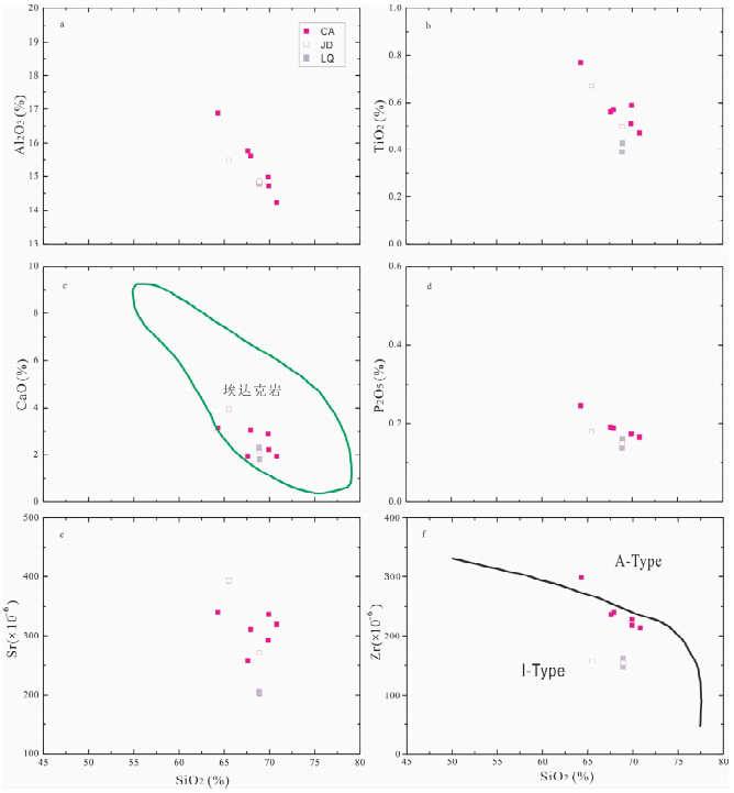 目前,皖南地区花岗闪长岩表现为I型花岗岩(Su et al., 2013; 袁峰等, 2005,2006; 周涛发等,2004; 张舒等,2009; 薛怀民等,2009; 钱辉和夏军,2010)。本次样品(SiO2=64.3%~70.8%)有较高的Na2O(大多>3.00%)、相对低的K2O(大多数<4.00%)、低Zr(<250×10-6)和Y(<18.5×10-6)含量,属于I型花岗岩(表 2、图 4f)。样品P2O5含量,随着SiO2含量的增加而呈明显的降低(图 4d),也暗示典型的I型花岗岩特征。