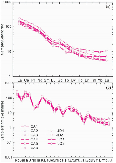 在哈克图解中,所有样品的Al2O3、TiO2、CaO、P2O5等氧化物含量与SiO2含量呈明显的负相关,即随着SiO2含量的增加而呈线性降低(图 4a-d),暗示可能存在矿物的分离结晶(如,斜长石、钛铁矿、磷灰石等)。