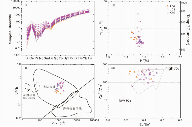 3个样品的Hf和Ti含量分别变化为1.14%~1.61%(平均值1.33%)和2.08×10-6~34.5×10-6(平均值5.50×10-6)(表 3)。Ti含量和TTiZ温度,随着Hf含量的增加而呈线性降低,除3个CA3锆石样品外,其它样品Ti含量均小于10×10-6,反映的温度大多数集中在600~700℃(图 6b)。样品的Y和U/Yb比值有明显的正相关关系,均落在陆壳锆石区域(图 6c)。锆石是能较好反应岩浆形成时温度的矿物,其中微量元素Ti是对岩浆形成温度的灵敏指示元素,能在地质活跃期间普遍保持封闭性(Watson et al., 2006)。根据锆石Ti含量计算出3个样品的结晶温度范围为619~863℃(均值在674℃)(Watson et al., 2006)(表 3)。