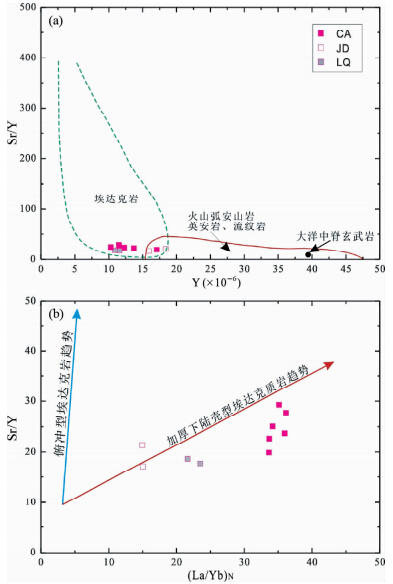 ![]() | 图 7 皖南花岗闪长岩Y-Sr/Y图解(a,据Defant and Drummond, 1990)和Sr/Y-(La/Yb)N图解(b,据Xie et al., 2012修改)Fig. 7 Plots of Y vs. Sr/Y(a,after Defant and Drummond, 1990) and Sr/Y vs.(La/Yb)N(b,modified after Xie et al., 2012)for granodiorites in Southern Anhui Province |