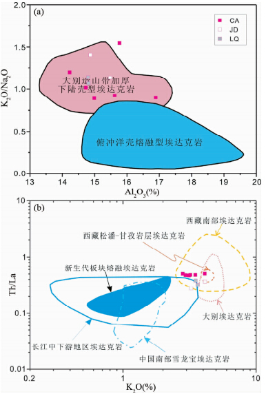 ![]() | 图 8 K2O/Na2O-Al2O3图解(a)和Th/La-K2O图解(b)数据来源:大别加厚下地壳埃达克质岩(Wang et al., 2007b; Huang et al., 2008);洋壳板块而来埃达克岩(Kamei et al., 2009);新生代板块熔融埃达克岩(Stern and Kilian, 1996);西藏南部埃达克岩(Hou et al., 2004);新生代下地壳西藏松潘-甘孜岩层埃达克岩(Wang et al., 2005);中国南部雪龙宝埃达克岩(Zhou et al., 2006);长江中下游地区埃达克质岩(Xie et al., 2012 and references therein)Fig. 8 K2O/Na2O versus Al2O3 diagram(a) and Th/La versus K2O diagram(b)Data source: Thickened lower crust-derived adakitic rocks from the Dabie orogen(Wang et al., 2007b; Huang et al., 2008); oceanic slab-derived adakites(Kamei et al., 2009); Cenozoic slab-derived adakites(Stern and Kilian, 1996)potassic adakites from South Tibet(Hou et al., 2004); Cenozoic lower crust-derived adakites in the Songpa-Ganze Terrane(Wang et al., 2005); adakites from the Xuelongbao in South China(Zhou et al., 2006); LYRB adakitic rocks(Xie et al., 2012 and references therein) |