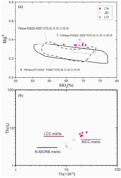 ![]() | 图 9 SiO2-Mg#图解(a)和Th-Th/U图解(b)数据来源:8~16kbar和1000~1050℃纯地壳部分熔体(Rapp and Watson, 1995);7kbar和825~950℃纯地壳部分熔体(Sisson et al., 2005);7~13kbar和825~950℃纯地壳部分熔体(Patiňo Douce and Johnston, 1991);LCC(下陆壳)和MCC(中陆壳)(Rudnick and Gao, 2003);MORB(Sun et al., 2008)Fig. 9 SiO2 vs. Mg# diagram(a) and Th vs. Th/U diagram(b)Data sources: Pure crustal partial melt at 8~16kbar and 1000~1050℃(Rapp and Watson, 1995); pure crustal partial melt at 7kbar and 825~950℃(Sisson et al., 2005); pure crustal partial melt at 7~13kbar and 825~950℃(Patiňo Douce and Johnston, 1991); LCC(lower continental crust) and MCC(middle continental crust)(Rudnick and Gao, 2003); MORB(Sun et al., 2008) |