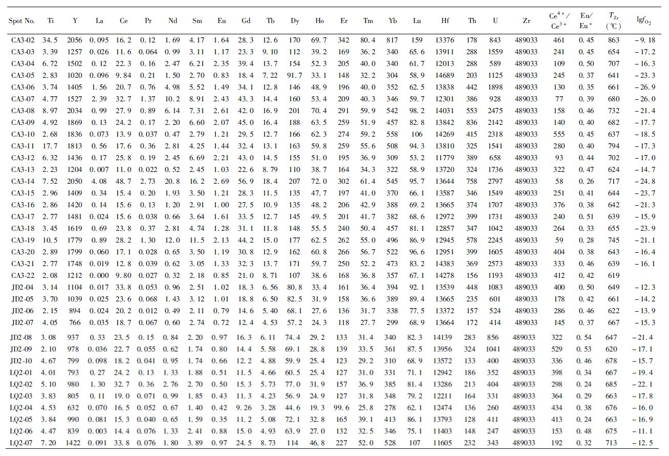 锆石是中酸性岩浆岩中广泛存在的副矿物,具有高保存性和高封闭温度(Cherniak and Watson, 2003),有较强的抵抗后期地质作用(物理、化学风化作用和热液蚀变等)影响的能力(Ballard et al., 2002; Scherer et al., 2007)。一般来说,锆石中Ce对岩浆氧化状态较敏感,这基于它们多离子价态(Ballard et al., 2002)。在锆石的八次配位离子中,Ce4+的半径(离子半径约0.101nm)比Ce3+的半径(离子半径约0.111nm)更接近于Zr4+的半径(离子半径约0.098nm),Ce4+比Ce3+的更容易进入锆石的晶格中。因此,锆石Ce4+/Ce3+比值可定性的估计岩浆氧逸度(Trail et al., 2011,2012; Qiu et al., 2013)。依据锆石Ce异常值和锆石Ti温度,Trail et al.(2011,2012)提出了一个新方法来确定岩浆熔体的氧逸度。详细的方法参见Trail et al.(2011,2012)和Qiu et al.(2013)。
