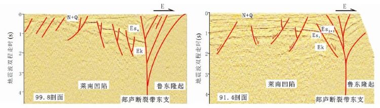 通过对区域地震剖面的分析及解释,莱州湾地区各不同构造单元的新生代结构特征存在着较大差异,凹陷内部近东西向断层发育。在南北向上,各负向构造单元总体显北断南超的半地堑(箕状断陷)结构。