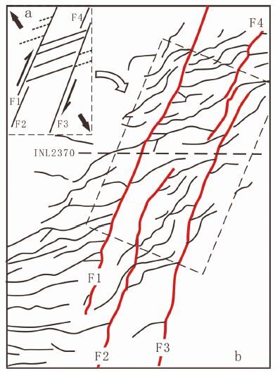 图 4 莱州湾凹陷东北部新近系馆陶组底界面断层组合图(图b据彭文绪等, 2009b,2010,改绘) 示郯庐断裂带东支断裂F1-F4及次生断层体系. 本图位置见图 1右上角虚线区;图中虚线为图 3b剖面位置 Fig. 4 The boundary fault image of Cenozoic Guan-Tao formation in northeast of Laizhou Bay sag(b,after Peng et al., 2009b,2010) |