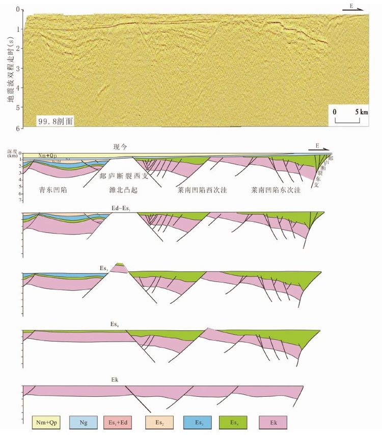 在古近纪晚期,西部抬升,遭受比东部相对更为强烈的剥蚀改造。莱南凹陷内部分割性较明显,在东西向上,至少存在两个西翘东倾的翘倾断块(图 5)。这期西部抬升,应与郯庐断裂带西支断裂带活动和其间断凸快速隆升有关。有必要说明的是,在莱州湾地区,于沙三期末发生了更为强烈的南北向隆降反转,使古近纪早期沉降幅度大、沉积厚的南部各凹陷快速抬升,前期沉积的沙三段及其下伏地层遭受强烈剥蚀。在莱南凹陷,沙三段几乎已被剥蚀殆尽,沙四段并遭受不同程度地剥蚀。所以在图 5演化剖面中,缺失沙三段地层。古地质构造恢复和区域对比研究表明,该区的南隆北降反转和西隆东降增强发生在沙三期末。