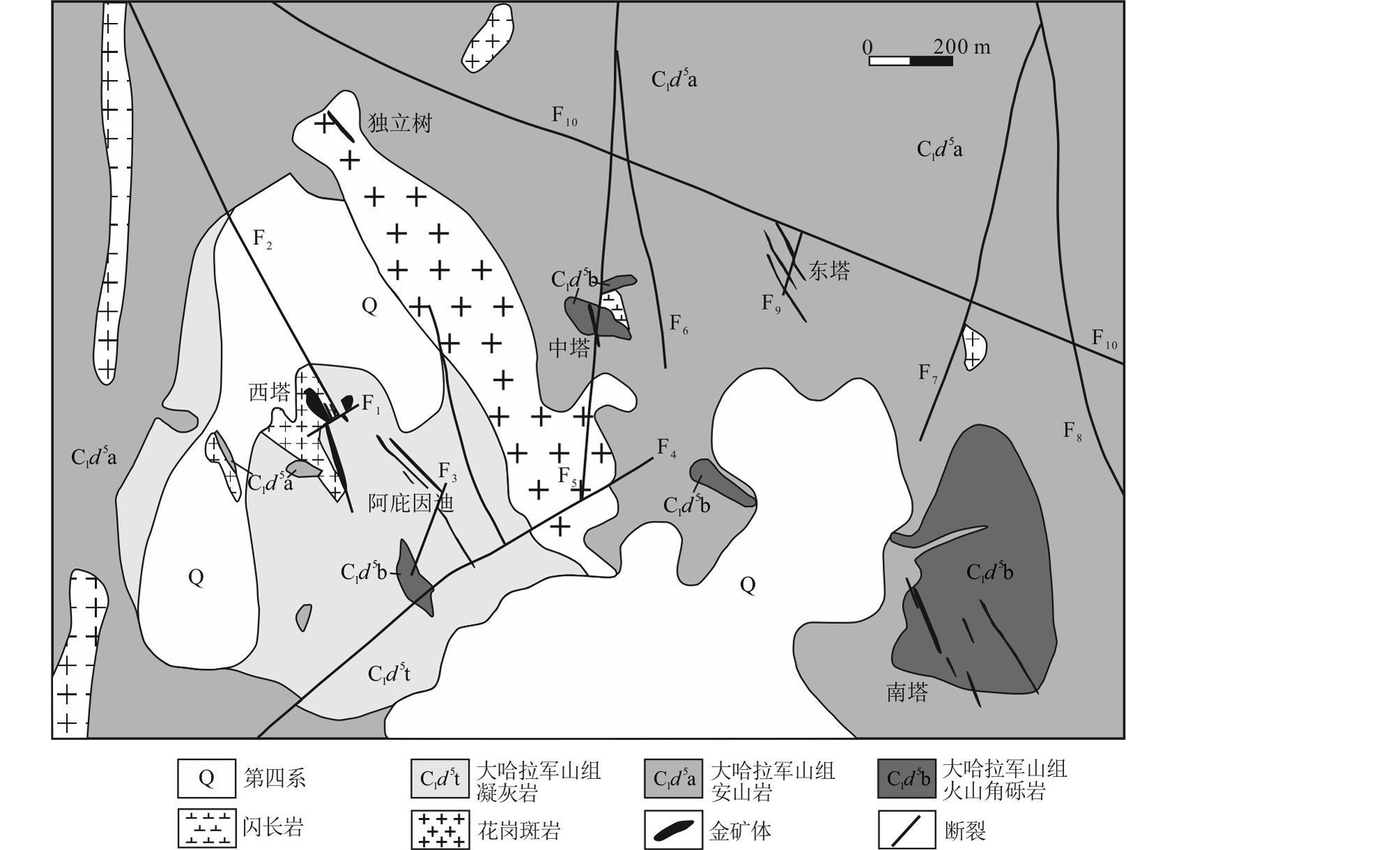 2 典型矿床地质特征2.1 阿希金矿床阿希金矿床是吐拉苏火山岩盆地内金矿床的典型代表。矿区出露地层主要为下石炭统大哈拉军山组第五岩性段(C1d5)中酸性火山岩和阿恰勒河组(C1a)碎屑岩(图 2),前者主要由杏仁状安山岩、英安岩、玄武岩、凝灰岩和角砾状凝灰岩组成,为阿希金矿床的直接赋矿围岩;后者主要为砾岩、含砾砂岩、泥岩和泥灰岩,呈角度不整合覆盖于大哈拉军山组火山岩之上。此外,矿区还出露少量次火山岩,岩性为二长斑岩和长石斑岩,它们与大哈拉军山组火山岩一起构成一套从次火山岩相、火山通道相到喷发-溢流相的古火山机构。