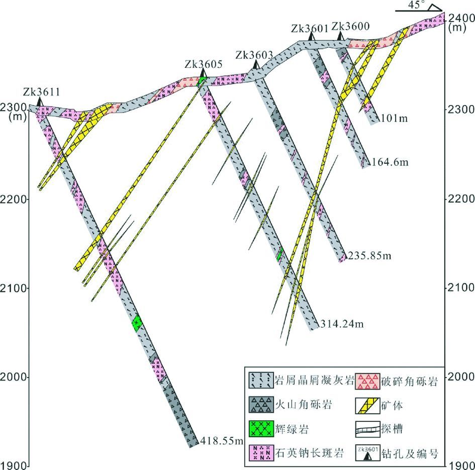矿区共圈定金矿体42条,多呈脉状、透镜状沿EW向断裂或NW向断裂分布,也几乎与地层平行,在延深和走向上分枝复合、尖灭再现、膨胀收缩特点明显(图 4)。Ⅰ1号金矿体规模最大,是目前主要开采对象,金矿化沿NW向断裂带产于石英钠长斑岩、流纹质凝灰岩、安山质凝灰岩中;金矿体与围岩无明显界限,须靠样品化验圈定;矿体长1050m,斜深666m,厚度2.08~31.85m(平均9.49m)平均品位1.2×10-6~3.46×10-6,最高品位40×10-6。