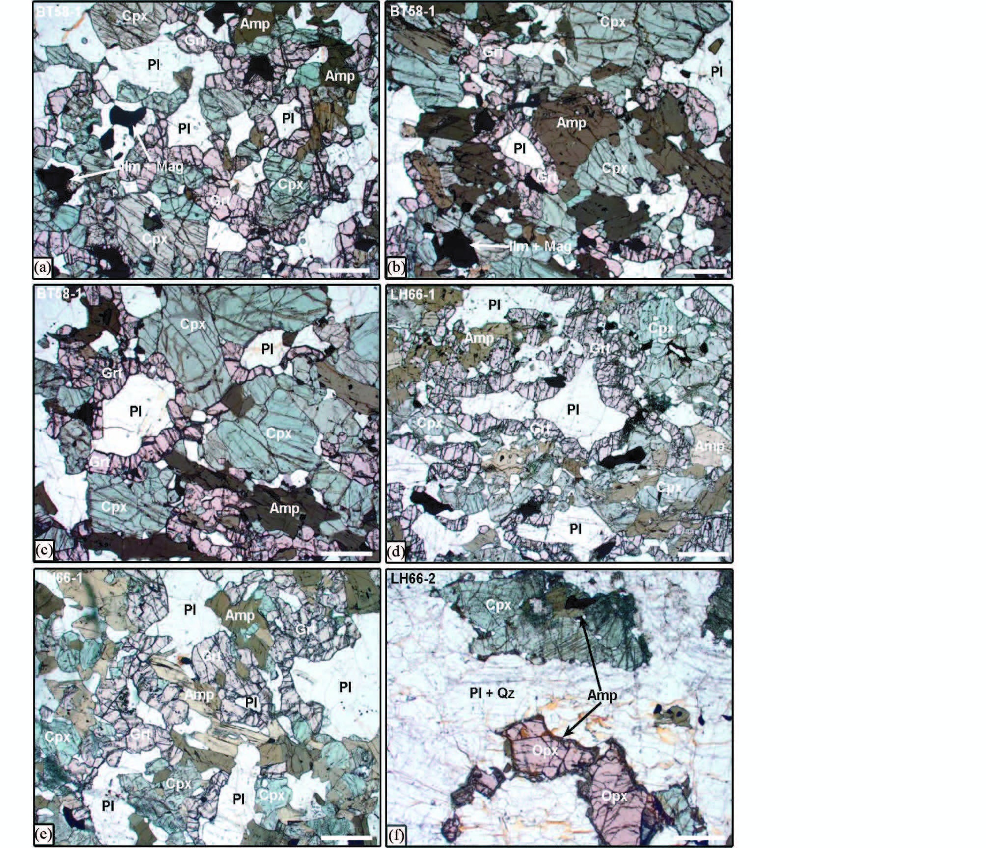 (a-e)石榴基性麻粒岩中保存的高压麻粒岩相矿物组合:斜方辉石+单斜辉石+斜长石+黑云母+钛铁矿+磁铁矿,石榴石呈链状分布粗粒的单斜辉石与斜长石;(f)石榴基性麻粒岩的围岩发育典型的麻粒岩相矿物组合:单斜辉石+斜方辉石,斜方辉石具有角闪石反应边;图中比例尺均为800μm Fig. 3 Photomicrographs showing the typical minerals and textures of the Wuchuan garnet mafic granulites(plane-polarized light) (a-e)garnet(Grt)+clinopyroxene(Cpx)+amphibole(Amp)+plagioclase(Pl)+quartz(Qz)+magnetite(Mag)+ilmenite(Ilm)as an index HP granulitic mineral assemblage identified in the matrix of the garnet mafic granulites,with Grt chains or coronas around coarse-grained Pl and Cpx;(f)typical granulite-facies mineral assemblage of Cpx+Orthopyroxene(Opx)of the county rocks of the garnet mafic granulites,with Amp rim around the coarse-grained Opx; the scale bar is 800μm in this figure |