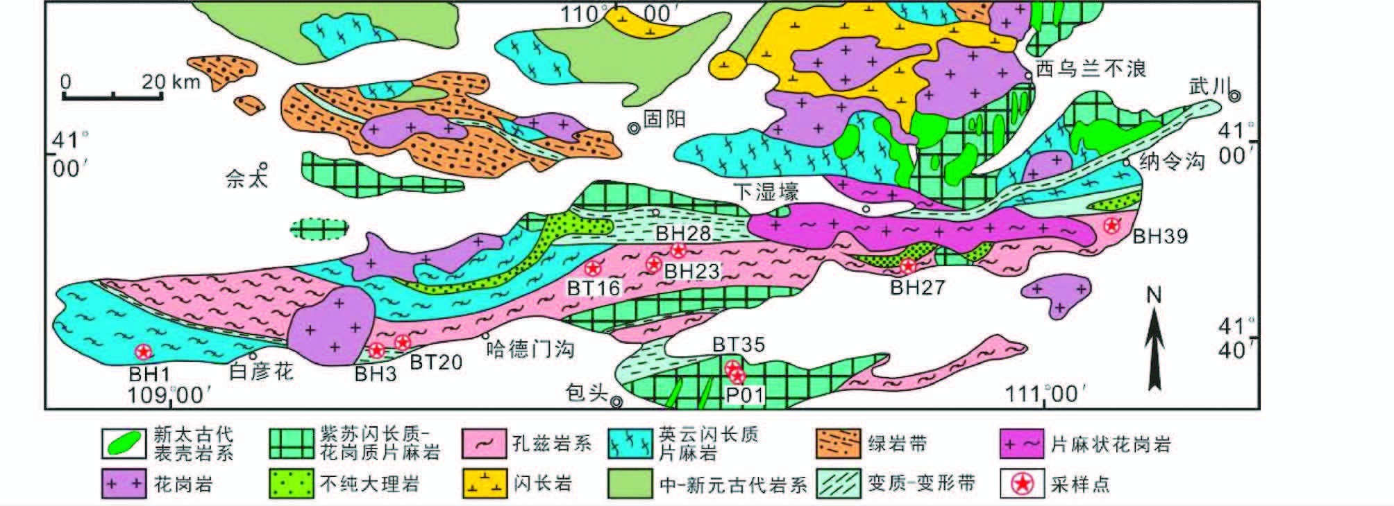 图 2 孔兹岩带乌拉山-大青山地区的地质简图及采样位置(据卢良兆等,1992) Fig. 2 Geological map of the Wulashan-Daqingshan area of the Khondalite Belt and sample localities(after Lu et al., 1992) |
