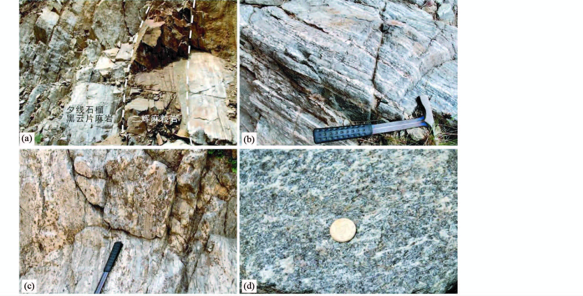 3 野外产状和岩相学特征孔兹岩带乌拉山-大青山地区的夕线(堇青)石榴二长片麻岩和石榴黑云二长片麻岩出露于巴彦花、哈德门沟、忽鸡沟、鸡灯湾和石拐区一带,均以似层状方式产出,其中夕线堇青石榴二长片麻岩可以夹层状产出于长英质片麻岩中,二者片麻理产状近一致。角闪二辉麻粒岩以大小不等的透镜状或似层状产出于夕线石榴二长片麻岩或(石榴)黑云斜长片麻岩中,两者的接触界线清晰(图 3a)。局部可见(含榴)长英质浅色体呈条带状、细脉状、团块状或网脉状,沿片麻理方向分布或切穿片麻理,其中石榴石呈浑圆状且粒径变化较大(0.1~0.8cm)(图 3b,c)。在夕线堇青石榴二长片麻岩中的堇青石围绕石榴石边部形成“黑眼圈”结构,长柱状的夕线石集合体呈近定向分布(图 3d)。代表性样品的显微结构特征见图 4。本文所有矿物代号均采用Whitney and Evans(2010)的资料。