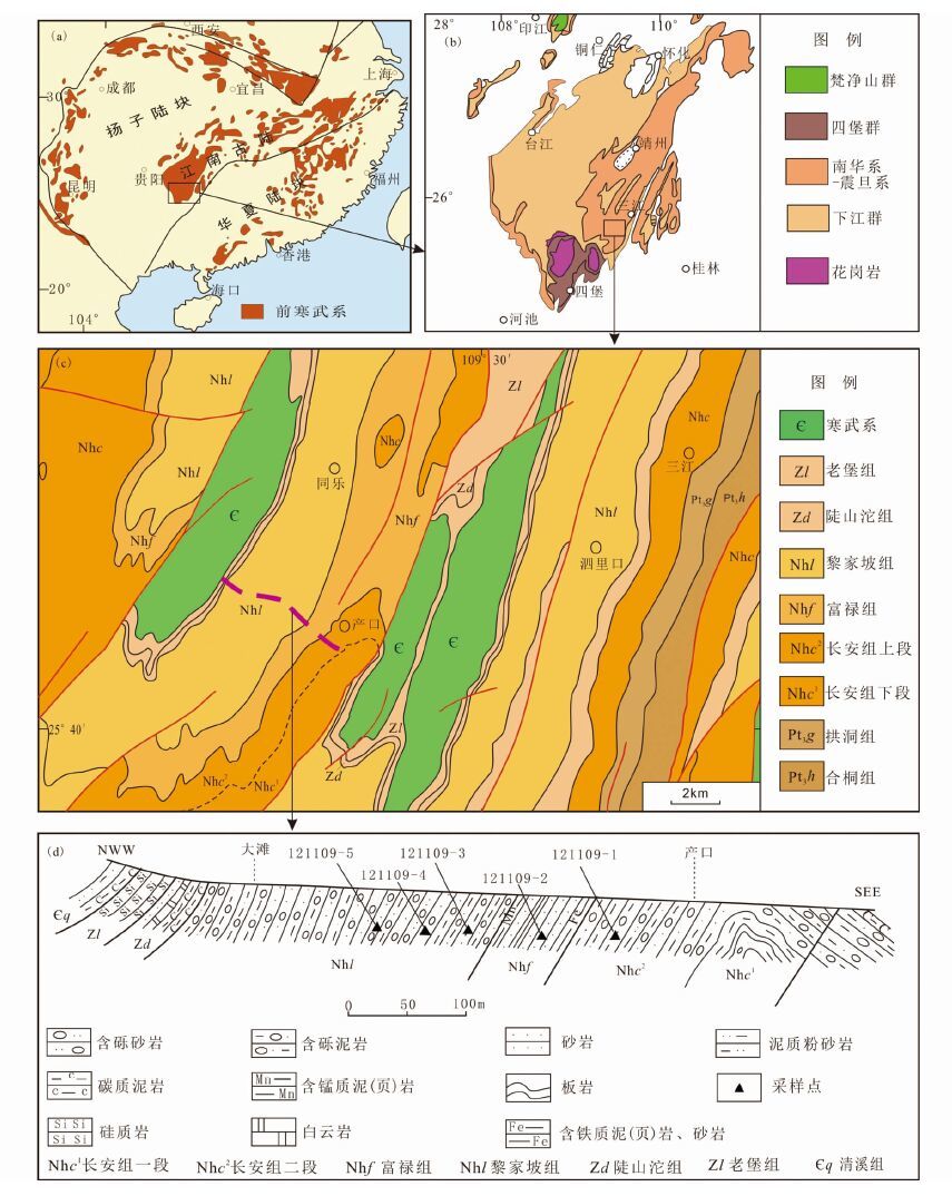 2 地质背景桂北地区位于扬子克拉通南部、江南造山带西南段,在四堡群、丹洲群变质基底之上广泛出露一套南华系盖层,沉积厚度从几十米到几千米不等,总体趋势是西厚东薄,属于冰川-滨浅海混合相,俗称“桂北型”沉积(单勇,1990; 田景春,1990)。区内构造总体呈北北东向,西南部出露新元古代元宝山岩体和摩天岭花岗岩(图 1b)。四堡群按岩性组合自下而上可分为九小组、文通组、鱼西组,为一套浅变质砂、泥岩,中部为浅变质细砂岩、粉砂岩夹6层基性熔岩、凝灰岩及科马提岩。丹洲群分布在桂北九万大山-越城岭一带,自下而上可划分为白竹组、合桐组、三门街组、拱洞组。西侧以含砾片岩、含砾千枚岩、变质砂砾岩为主,与下伏四堡群呈角度不整合接触,该不整合对应四堡运动。南华系由下至上分别为长安组、富禄组(大塘坡)、黎家坡组(泗里口组、南沱组)(表 1)。长安组在岩性上主要由轻变质含砾砂质泥岩、轻变质含砾泥质硬砂质长石石英砂岩、薄层绢云板岩、含砾砂岩、细粒砂岩、粉砂岩、板岩、粉砂质页岩等构成,有些岩层见水平层理,在金城偶见坠石构造,其中砾石呈半圆-次棱角状,岩石呈基底式胶结或孔隙式胶结,与下覆地层丹洲群局部有平行不整合接触;富禄组在中国南方分布广泛,是中国南方前震旦纪地层划分的一个区域性标志层,同时也是中国南方锰矿的重要产出层位之一,底部含铁质泥(页)岩、顶部含锰质泥(页)岩、长石硬砂质砂岩、泥质长石质硬砂岩、硬砂质砂岩等组成;黎家坡组由灰绿色块状轻变质含砾砂质泥岩、含砾泥岩,间夹薄层砂岩、粉砂岩、板岩及泥岩,杂砾岩大都呈块状,不显层理,但砾石有时又具定向排列而略显层次。砾石成分复杂,有些表面有擦痕,呈次棱角状-半滚圆状。黎家坡组在本地区与上覆震旦系地层普遍呈平行不整合接触或接触关系不明。震旦系地层按岩性可分为陡山沱组和老堡组,为连续沉积,基本由页岩、硅质岩夹透镜状白云岩组成。卢定彪等(2010)和林树基等(2010)认为,在湘黔桂交界区南华大冰期包括两个冰期(长安冰期、南沱冰期)和一个富禄间冰期的沉积演化史。