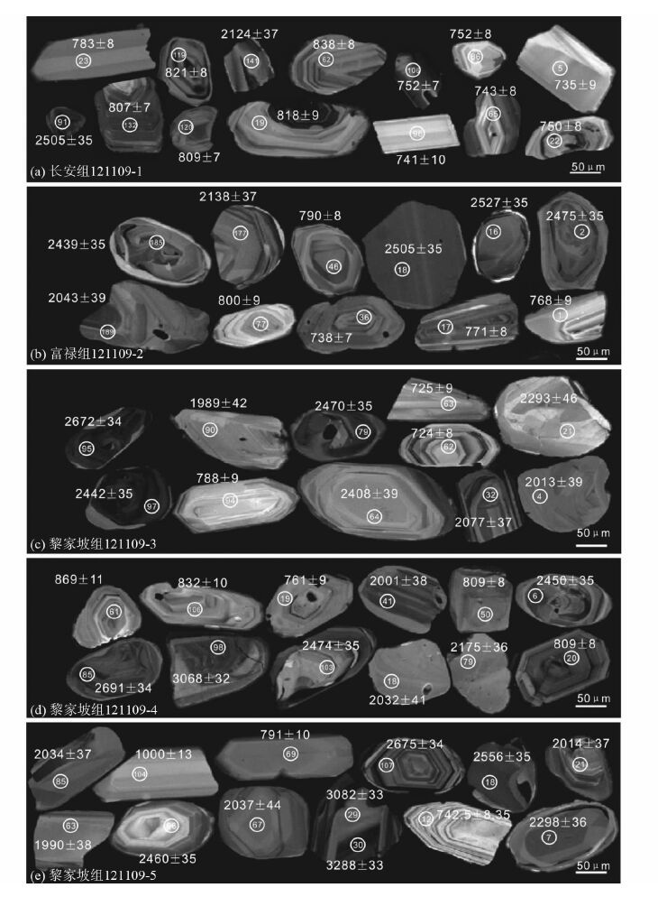 图 2 长安组、富禄组、黎家坡组砂岩碎屑锆石CL图像 Fig. 2 Images(CL)of detrital zircons from sandstone in the Chang’an,Fulu and Lijiapo formations |