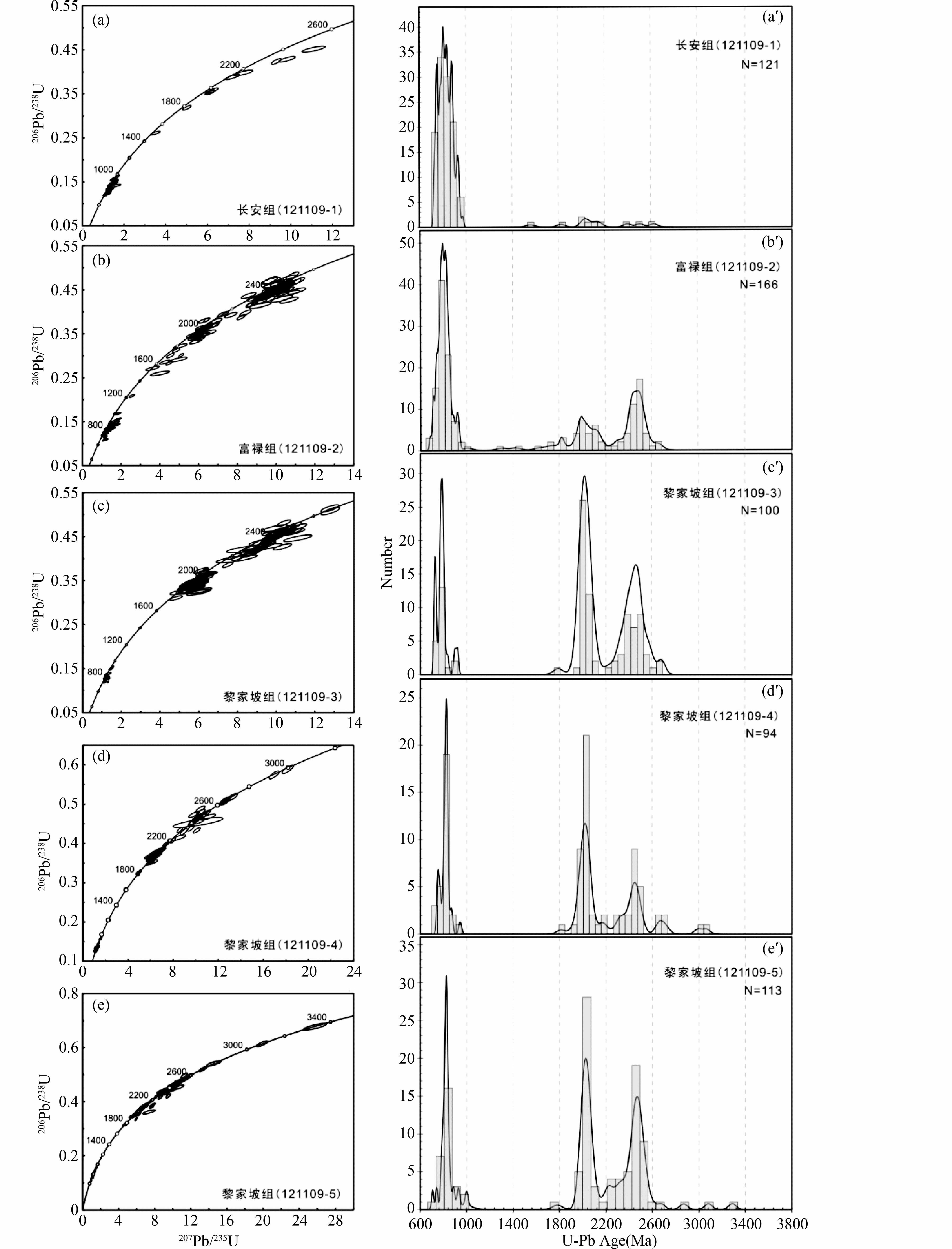 样品121109-4与样品121109-3相似,碎屑锆石颗粒呈圆状、长柱状,透射光下大部分无色透明,有些黄褐色、玫瑰色,阴极发光图像基本显示振荡环带,颜色有灰黑色、灰白色,有些呈黑色(图 2d)。锆石的Th/U比值除了有1个21.85,其余均在0.39~3.73之间,均为岩浆成因锆石。对该样品进行了94颗锆石的测试分析(测试结果未列出),相应的207Pb/235U-206Pb/238U谐和关系图解和年龄频率直方图见图 3d,d’所示。主要分为三组年龄,第一组年龄从748±9Ma~944±13Ma,年龄峰值为822Ma,有30个分析点,占测试总数的32%;第二组年龄范围从1813±38Ma~2192±41Ma,年龄峰值为2040Ma,有37颗锆石,占测试数据的39%;第三组年龄从2296±38Ma~2726±34Ma,分析点数为24颗,占测试总数的26%,其峰值为2440Ma,最老的1颗锆石3068±32Ma,位于谐和线上。