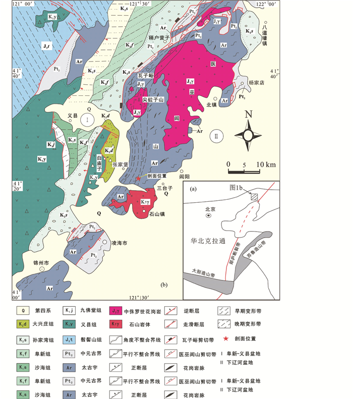 2 地质背景医巫闾山变质核杂岩地处辽西东部,华北克拉通东北缘。其主隆起由太古代变质基底与晚侏罗世-早白垩世岩体呈线状排列整体呈NNE向展布,西侧为阜新-义县白垩纪沉积盆地,两者经由瓦子峪主拆离断层相接,东侧由一条隐伏断裂与古近系下辽河盆地相邻,组成NNE向“两盆夹一隆”的构造格局(图 1)。