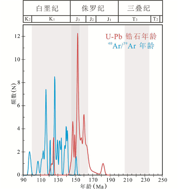 图 10 医巫闾山变质核杂岩花岗质岩石锆石U-Pb及40Ar/39Ar年龄频率图 部分数据来源:Darby et al., 2004; Zhai et al., 2004; 吴福元等, 2006; 杜建军等, 2007; Zhang et al., 2008; Lin et al., 2013a; Li et al., 2013; 李刚等, 2012, 2013; 张必龙等, 2011a, b, 2012, 2013a, b Fig. 10 Frequency diagrams of compiled U-Pb zircon and 40Ar/39Ar geochronological data of Mesozoic granitic rocks from the Yiwulüshan metamorphic core complex |