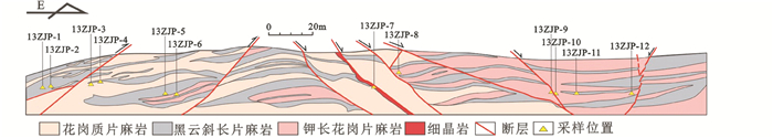 图 2 医巫闾山变质核杂岩南部张家堡地区花岗质岩石变形剖面及采样位置 Fig. 2 Representative deformation profile of granitic rocks cross Zhangjiapu area from southern Yiwulüshan metamorphic core complex with sample locations |