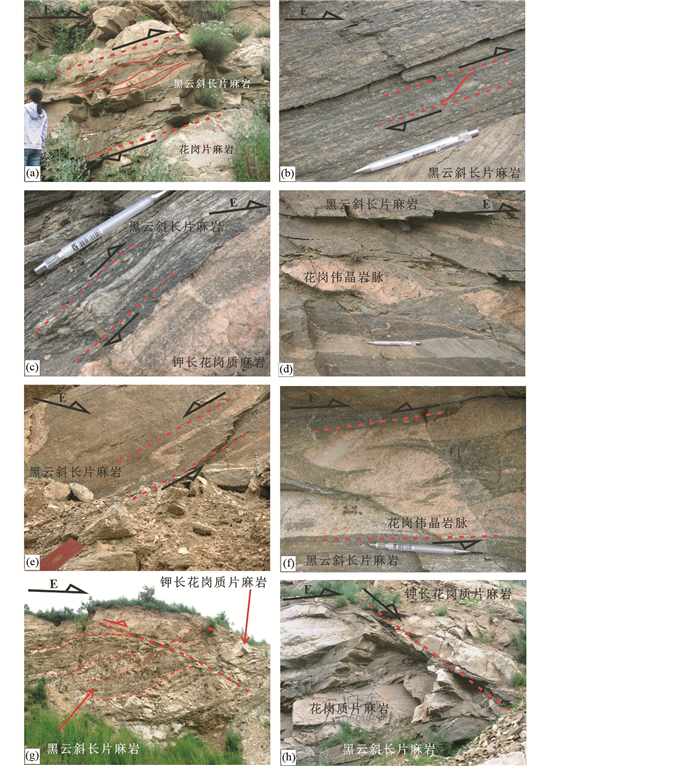 右行韧性剪切主要发育于太古宙基底变质岩系内,以花岗质片麻岩为主,岩石中发育有糜棱组构,长英质多晶条带多发生石香肠化或形成“眼球”状构造。强烈的剪切变形导致太古宙基底变质岩系发生分异,黑云母、角闪石等暗色矿物和长石、石英等浅色矿物分异形成相间条带。分异温度较高,岩石属于半流动塑性状态,黑云斜长片麻岩呈透镜状、条带状分布于花岗质片麻岩中(图 2、图 3a),部分条带强烈弯曲,形成不对称流动褶皱(图 3b),长英质集合体旋转形成“眼球”构造(图 3b, c)。中生代同构造侵位钾长花岗岩以规模不一的岩脉形式侵入到太古宙基底变质杂岩中,与围岩具有近似“互层状”产出的特点(图 3c, g),岩体边部发生不同程度的糜棱岩化,形成与围岩相似的糜棱叶理。变形带中还发育矿物拉伸线理、杆状构造(图 3b),显示高温剪切变形是在伸展环境下形成的(图 3g, h)。局部可见S-C组构与σ型旋转岩块,指示右行剪切(图 3b, c)。岩石遭受变形改造,最常见的构造形迹包括云母定向排列以及石英、长石的细粒化形成的较平缓的变形面理,倾角16°~28°,石英拉长形成矿物拉伸线理,总体倾伏角较缓,主要向NNE-SSW倾伏,指示原始向NNE-SSW向韧性走滑剪切变形,早期为一套大型近水平的韧性拆离剪切带。