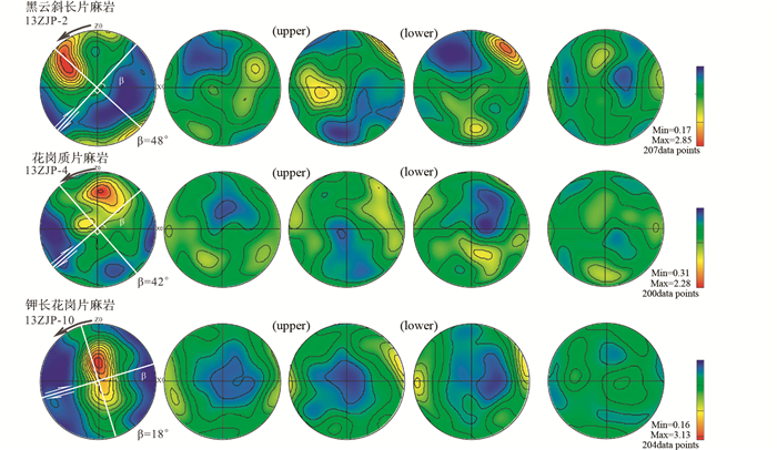 由此可求出变形过程中平均运动学涡度值。本次研究运用电子背散射技术(EBSD)确定的石英C轴优选方位(图 5),3个中高温变形岩石样品运动学涡度值为0.98、0.95和0.82,平均0.92。