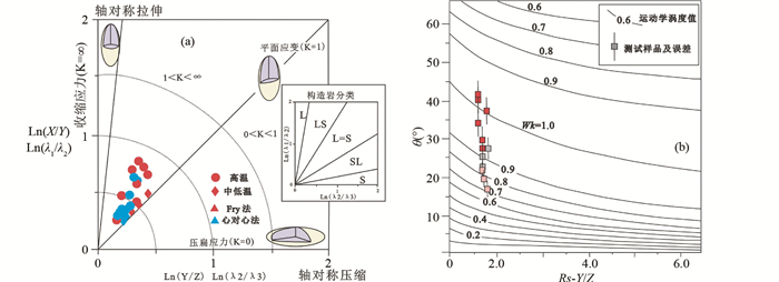 图 6 Flinn有限应变判别图(a)和Rs-θ曲线法估算运动学涡度(b) Fig. 6 Flinn finite strain discrimination diagram (a) and estimation of kinematic vorticity based on Rs-θ method (b) |