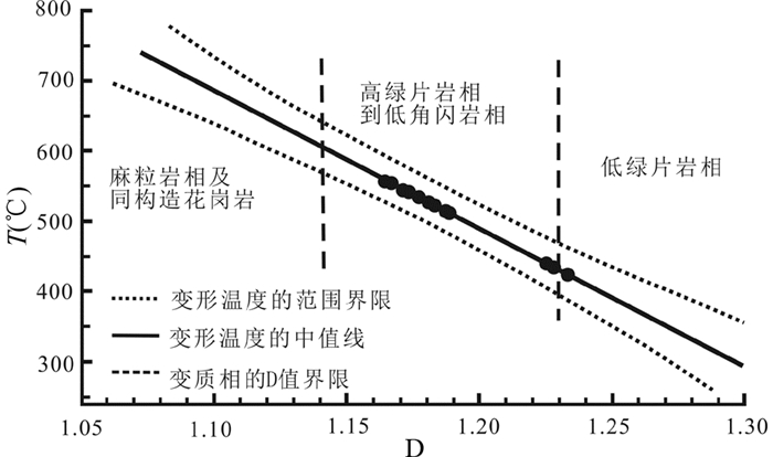 12个糜棱岩样品中动态重结晶石英颗粒边界统计数据分维数1.171至1.233,具有统计意义上的自相似性。对照Kruhl温度计和分形维数D与变形温度T关系图(图 7),判断早期变形温度大约在500~600℃,相当于高绿片岩相到低角闪岩相,属中浅地壳层次,晚期变形温度大约在400~500℃,属浅地壳层次。