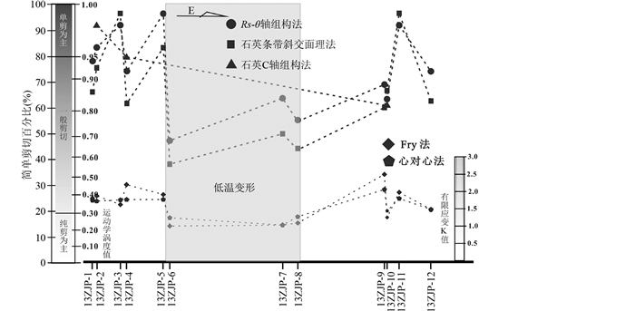 有限应变Flinn指数K值趋势图(图 8)表明,不同方法测得的K值具有一致性,Fry法与长短轴法可信度一致。图解显示早期高温变形过程中K值大于晚期低温变形,表明早期具有较强拉伸作用。早期形成的高温韧性变形岩石多为LS和L=S构造岩,与野外观察到的大量叶理、A型及B型线理相对应;晚期低温韧性变形岩石以L=S构造岩为主,野外较少发育B型线理,多片理化,以及太古代基底杂岩中的不对称褶皱等。有限应变Flinn指数K值与野外实际观察结果接近一致,表明有限应变测量能够较真实反应岩石宏观特征。
