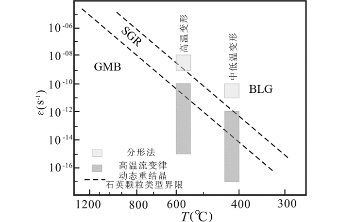 在T-ε图解中(图 9),高温变形岩石在估算的变形温度范围内,利用分形法获得的ε投影在BLG+SGR区,高温流变率估算的ε投影跨越SGR+GMB区。3个低温变形岩石利用分形法计算的ε投影在BLG区,高温流变率计算的ε投影跨越三个区。结合两种估算方法的适用范围,结合估算的变形温度,推测分形法计算结果可能小于实际的应变速率,高温流变率估算结果可能更可信,可作为分析的重要参考值(Hacker et al., 1990)。
