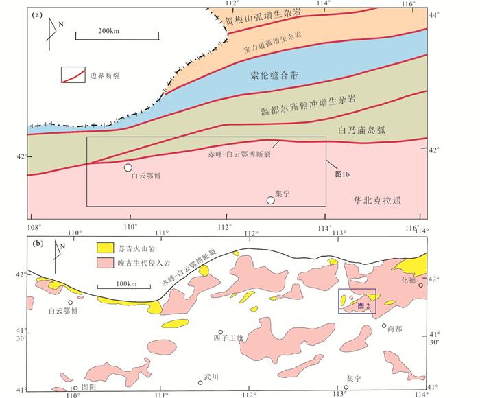 苏吉火山岩区域上显示出与晚古生代侵入体密切共生并更靠近华北克拉通北缘边界的特征(图 1b)。苏吉火山岩首先是通过区域地质填图在白云鄂博一带识别出来的(内蒙古自治区地质调查院, 2002)。最近的研究揭示白云鄂博一带苏吉火山岩的形成时代介于278~264 Ma,并可能向东延伸至四子王旗以东地区(Zhang et al., 2016)。最新的区域地质填图成果显示(吉林大学地质调查研究院, 2015①),沿华北克拉通北缘边界(赤峰-白云鄂博断裂南缘)自白云鄂博以西开始,向东一直延伸至研究区以东的化德境内可能分布着一条数百千米的晩古生代火山岩带。