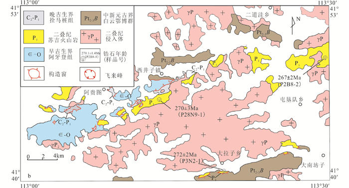 华北拉通北缘主要由早前寒武纪基底及中新元古界以来的沉积盖层组成,并发育大量海西期岩浆岩。中新元古界白云鄂博群通常被认为是华北克拉通北缘中-新元古代大陆边缘裂谷带的一部分,也是研究区最为发育的前寒武纪沉积地层(Pt2-3B);早古生界发育一套含动物化石的阿牙登组(∈-O)海相碎屑岩-灰岩建造;晚古生界先后形成了富含植物化石的拴马桩组陆相碎屑岩和苏吉火山岩。详细的地质填图显示,中新元古界白云鄂博群和早古生界阿牙登组并非原地地层,而是呈推覆体形态覆于晚古生界拴马桩组和苏吉火山岩之上,从而在研究区形成构造窗-飞来峰交错产出的构造格局(图 2)。