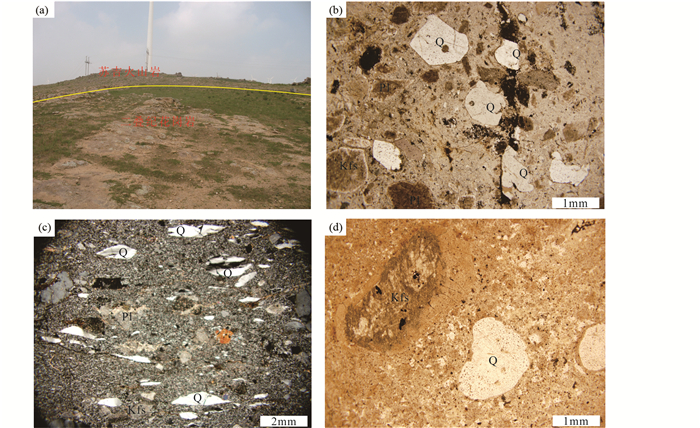 图 3 苏吉火山岩的产出及岩石学特征 (a)二叠纪花岗岩侵入苏吉火山岩;(b)流纹质凝灰岩;(c)糜棱岩化凝灰岩;(d)流纹岩. Q-石英; Kfs-钾长石; Pl-斜长石 Fig. 3 Outcrop and petrological characteristics of Suzy volcanic rocks (a) Permian granitic intruded into Suzy volcanic; (b) rhyolitic tuff; (c) mylonitized tuff; (d) rhyolite. Q-quartz; Kfs-K-feldspar; Pl-plagioclase |