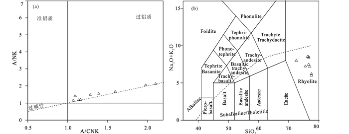 图 4 苏吉火山岩的A/NK-A/CNK图解(a, 据Shand, 1943)和TAS图解(b, 据Le Bas et al., 1986) Fig. 4 A/NK vs. A/CNK (a, after Shand, 1943) and TAS (b, after Le Bas et al., 1986) classification diagrams for Suzy volcanic rocks |