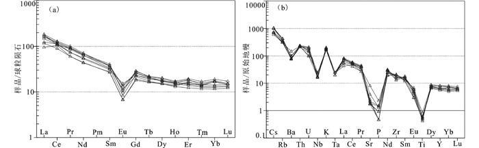 苏吉火山岩的稀土总量中等(∑REE=167×10-6~245×10-6),轻重稀土分馏较强(LREE/HREE=7.5~11.2),Eu负异常明显(δEu=0.29~0.57),具有一致的右倾型稀土配分曲线(图 5a)。在微量元素蛛网原始地幔标准化蛛网图中,所有样品表现出较好的一致性。大离子亲石元素K、Rb、Ba含量较高,而Sr亏损;P元素以及高场强元素Nb、Ta、Ti强烈亏损(图 5b)。