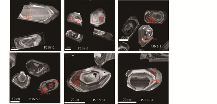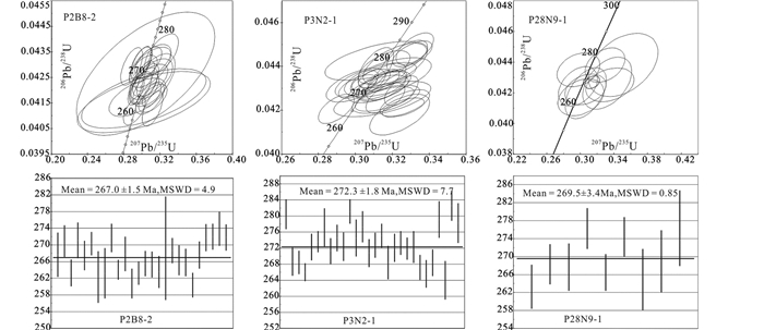 我们共采取了3件定年样品,分别为流纹质凝灰岩(P2B8-2)、糜棱岩化流纹岩(P3N2-1)及流纹岩(P28N9-1)(表 2)。