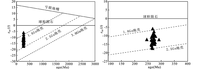 图 8 苏吉火山岩的锆石εHf(t)-锆石年龄图解 Fig. 8 εHf(t) vs. zircon ages plots for Suzy volcanic rocks |