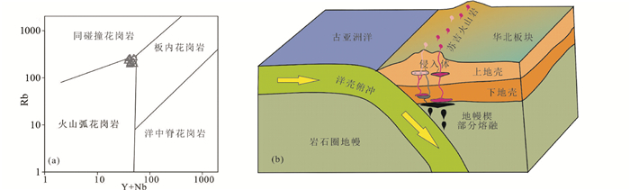 在Rb-Y+Nb图解中(图 9a),苏吉火山岩主要落入火山弧花岗岩区域,少许落在火山弧花岗岩与同造山界线附近,进一步指示它们形成于俯冲阶段(大陆边缘弧)或俯冲向同碰撞的转折期。苏吉火山岩古老的Hf二阶段模式年龄指示它们主要源自华北克拉通基底组分的部分熔融,与前述钙碱性中-酸性侵入体特征相似(Ma et al., 2013; 王惠初等, 2007; Xiao et al., 2003, 2009; Zhang and Zhao, 2013; Zhang et al., 2007a, 2009a, b),表明它们与这些侵入体的源区特征一致,也进一步表明苏吉火山岩是大陆边缘弧成因的。