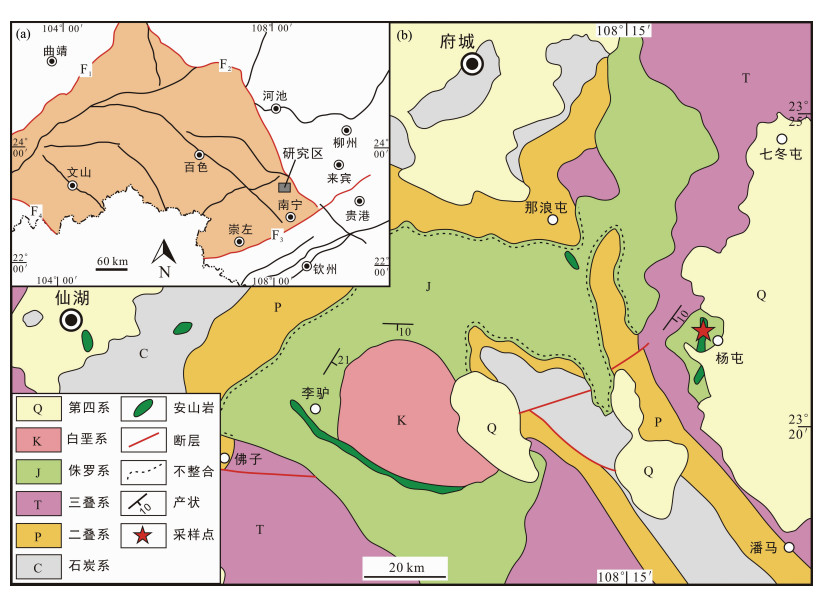 图 1 右江盆地的构造简图(a, 据杜远生等, 2013修改)和杨屯地区地质概况及采样点位置(b, 据广西壮族自治区地质矿产局, 1970修改) F1-师宗-弥勒断裂; F2-紫云-南丹断裂; F3-凭祥-南宁断裂; F4-红河断裂 Fig. 1 Tectonic framework of the Youjiang basin (a, modified after Du et al., 2013) and geological map of the Yangtun area with sampling location (b, modified after BGMRG, 1970) F1-Shizong-Mile Fault; F2-Ziyun-Nandan Fault; F3-Pingxiang-Nanning Fault; F4-Red River Fault |