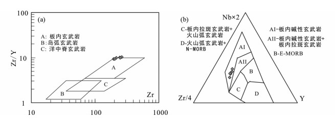 图 10 杨屯安山岩的Zr-Zr/Y (a, 据Pearce and Norry, 1979)和Zr/4-Y-Nb×2 (b, 据Meschede, 1986)图解 Fig. 10 Zr-Zr/Y (a, after Pearce and Norry, 1979) and Zr/4-Y-Nb×2 (b, after Meschede, 1986) diagrams of the Yangtun andesite |