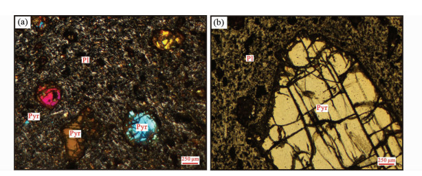 图 2 杨屯安山岩的显微照片 Pyr-辉石; Pl-斜长石 Fig. 2 Photomicrographs of the Yangtun andesite Pyr-pyroxene; Pl-plagioclase |