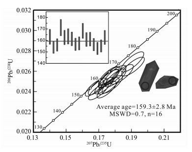 4 分析结果 4.1 LA-ICP-MS锆石U-Pb年代学特征本文对采自广西省武鸣县杨屯安山岩样品(13YK-83A)进行了LA-ICP-MS锆石U-Pb定年分析,分析结果见表 1。分选自该样品的锆石呈浅褐或褐色,半透明或透明。大部分锆石呈短柱状,少量呈长柱状,长60~100μm,长宽比为2:1~4:1。锆石CL图像可见典型韵律环带结构,属于岩浆成因锆石。本文测定了18颗锆石,它们的Th/U比值为0.7~2.8,均大于0.1,表明为岩浆成因锆石(吴元保和郑永飞, 2004)。其中两个分析点的207Pb/235U表观年龄分别为2810Ma和738Ma,该两颗锆石应该是岩浆上升过程中捕获的围岩继承锆石。剩余16个分析点的206Pb/238U表观年龄变化范围为153.0~171.2Ma,加权平均年龄为159.3±2.8Ma (MSWD=0.7,n=16,图 3),该年龄代表了杨屯安山岩的喷发年龄。