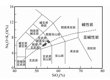 图 4 杨屯安山岩的SiO2-Na2O+K2O图解 Fig. 4 SiO2 vs. Na2O+K2O diagram of the Yangtun andesite |