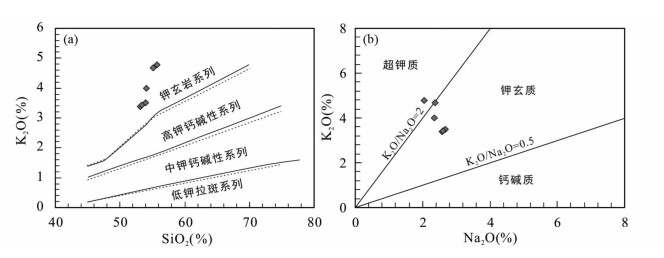 图 5 杨屯安山岩的SiO2-K2O (a, 实线来源于Peccerillo and Taylor, 1976; 虚线来源于Middlemost, 1985)和Na2O-K2O (b)图解 Fig. 5 SiO2 vs. K2O (a, solid line is after Peccerillo and Taylor, 1976; dotted line is after Middlemost, 1985) and Na2O vs. K2O (b) diagrams of the Yangtun andesite |