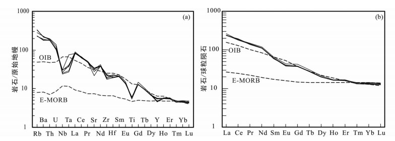 图 6 杨屯安山岩的微量元素原始地幔标准化蛛网图(a)和稀土元素球粒陨石标准化配分图(b) (OIB、E-MORB、原始地幔和球粒陨石标准化数据均引自Sun and McDonough, 1989) Fig. 6 Primitive mantle-normalized spidergram (a) and chondrite-normalized REE pattern (b) of the Yangtun andesite (data of OIB, E-MORB, primitive mantle and chondrite are from Sun and McDonough, 1989) |