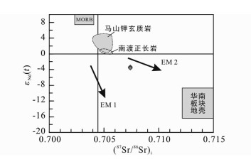 本文对杨屯安山岩的两件样品进行了Sr-Nd同位素分析,结果见表 2。测得它们的87Sr/86Sr比值为0.70876~0.70879,143Nd/144Nd比值为0.51236~0.51237。采用样品的喷发年龄(159Ma)计算它们的初始Sr-Nd同位素组成,其(87Sr/86Sr)i值变化范围为0.70738~0.70739,εNd(t)值变化范围为-3.6~-3.4,明显不同于云开地区马山和南渡钾玄质岩的同位素组成(图 7; 陈新跃等, 2013; 段瑞春等, 2013; 劳妙姬等, 2015)。