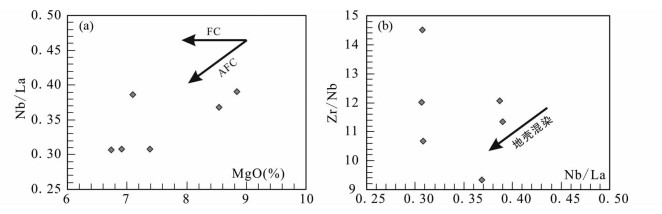 图 8 杨屯安山岩的MgO-Nb/La (a)和Nb/La-Zr/Nb (b)图解 Fig. 8 MgO vs. Nb/La (a) and Nb/La vs. Zr/Nb (b) diagrams of the Yangtun andesite |