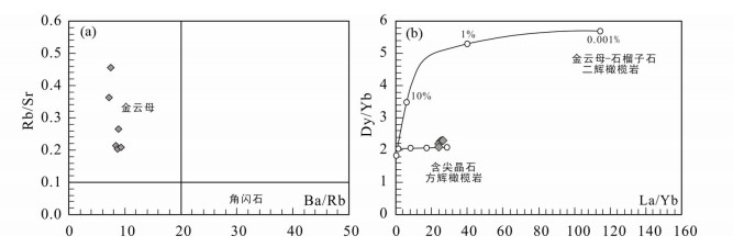 (2) 杨屯火山岩具典型高镁安山岩和钾玄质岩的地球化学特征,是含金云母的富集岩石圈地幔部分熔融的产物。