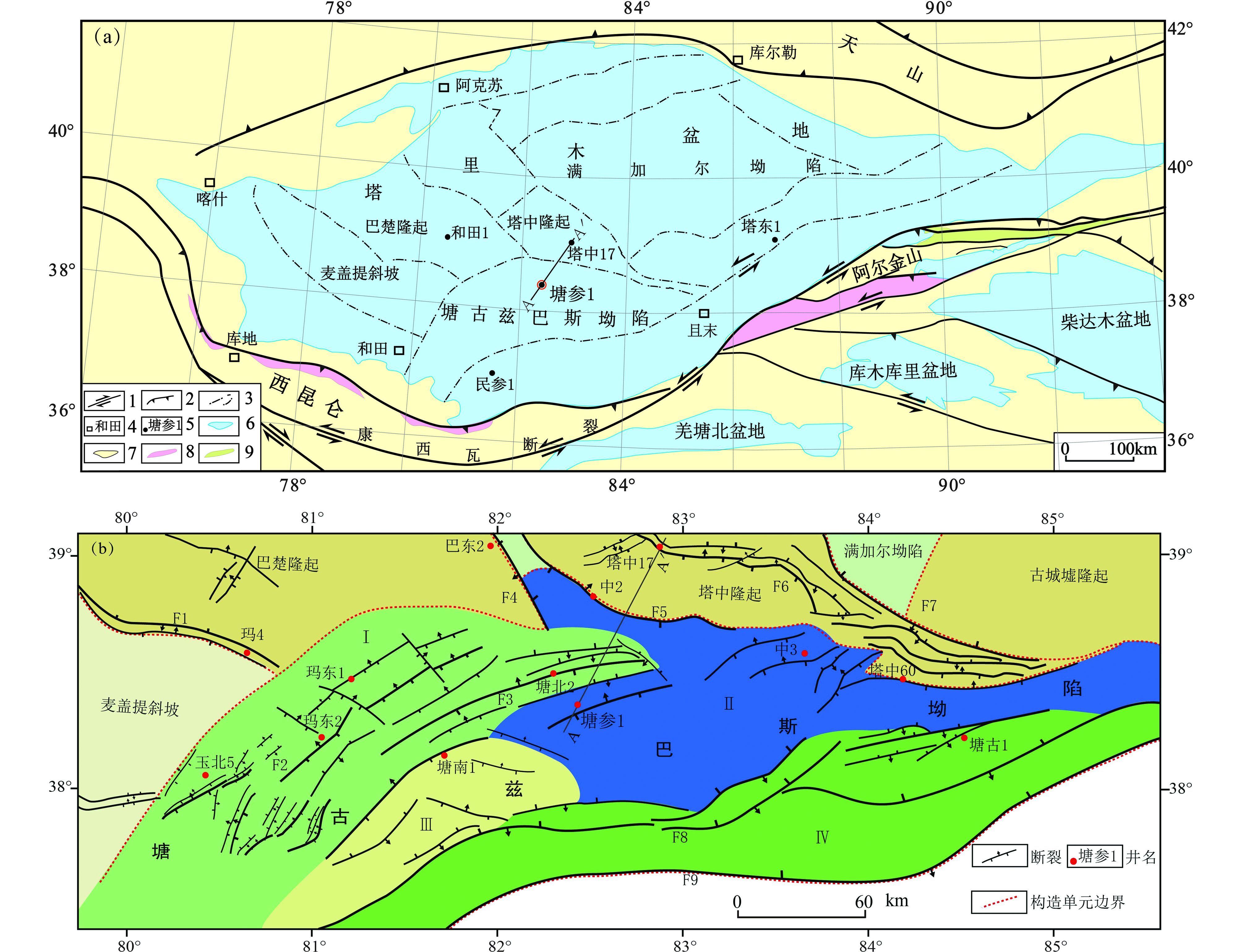 图 1 塘古兹巴斯坳陷位置及构造单元划分图(据何碧竹等,2011b改编) (a)塘古兹巴斯坳陷位置;1-边界走滑断层;2-边界逆冲断层;3-盆地构造单元边界;4-地名;5-井名;6-沉积盆地;7-造山带;8-俯冲碰撞杂岩带;9-俯冲增生杂岩带.(b)塘古兹巴斯坳陷构造单元划分图;构造单元:Ⅰ-玛东-塘北断裂构造带;Ⅱ-塘古兹巴斯凹陷;Ⅲ-塘南台地;Ⅳ-塘南断裂构造带;主要断裂:F1-玛扎塔格断裂;F2-玛东断裂;F3-塘北断裂;F4-巴东断裂;F5-塔中南缘断裂(中2断裂);F6-塔中Ⅱ号断裂;F7-塔中Ⅰ号断裂;F8-塘南断裂;F9-车尔臣断裂 Fig. 1 The location and structural units of Tangguzibas depression in the Tarim basin(modified after He et al.,2011) |