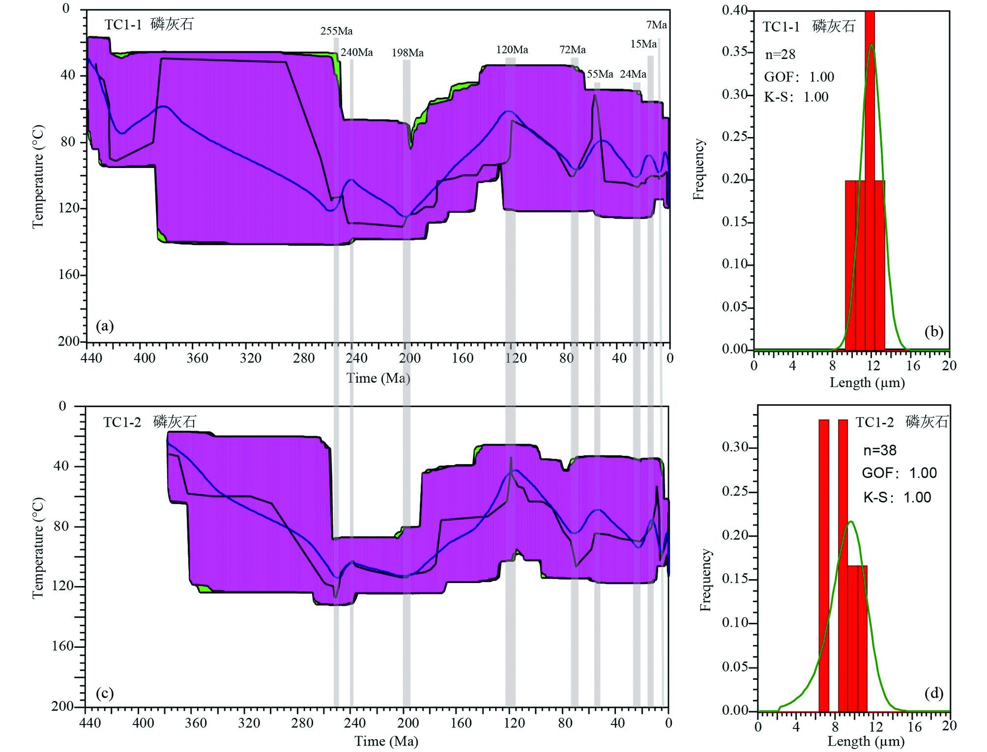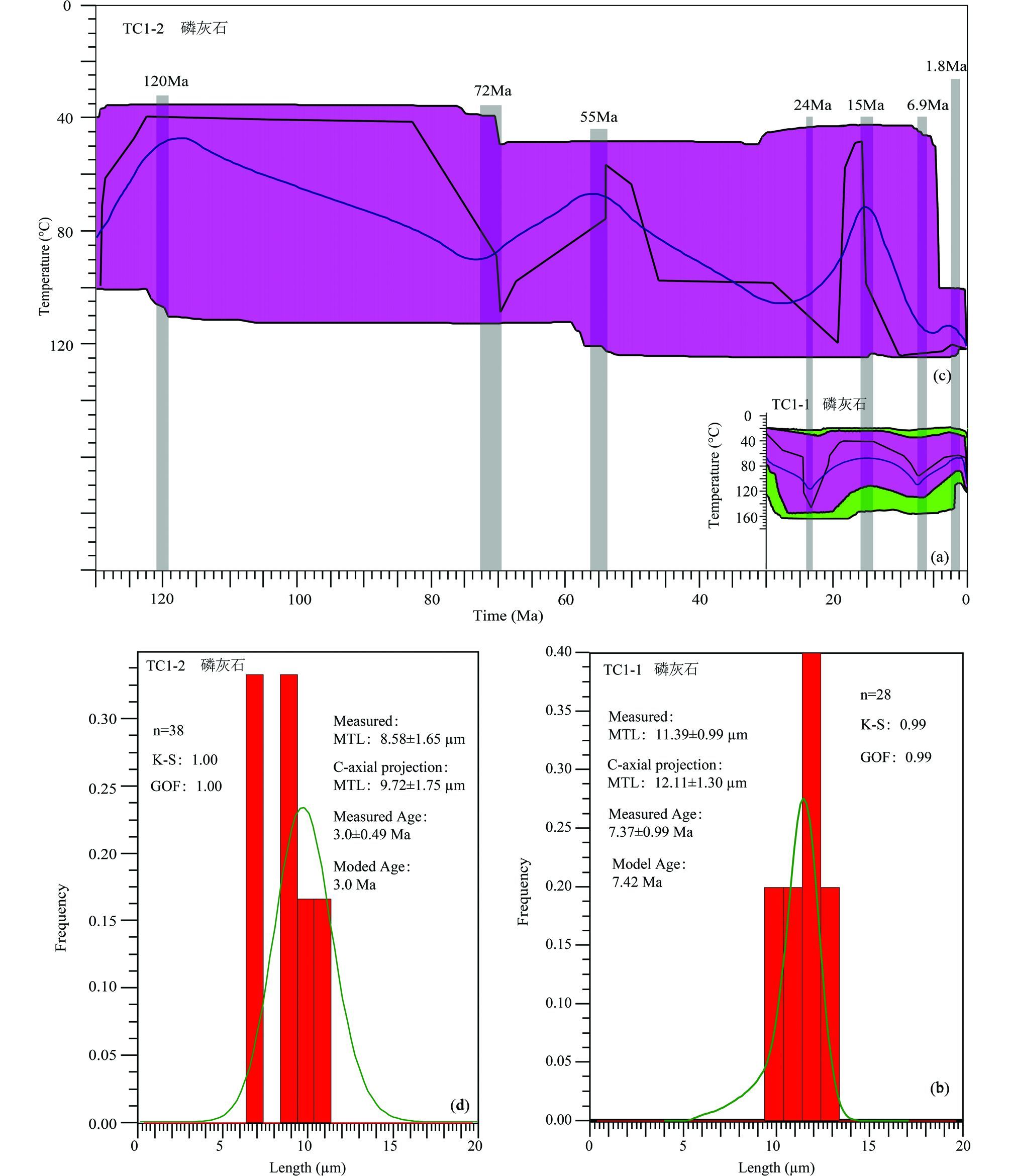 根据Ketcham et al.(2007a)的方法测量磷灰石C-轴投影径迹长度,TC1-1磷灰石测量平均径迹长度为11.39±0.99μm,C-轴投影平均长度为12.11±1.30μm(图 5b),裂变径迹长度分布呈单峰式;TC1-2磷灰石测量平均径迹长度为8.58±1.65μm,C-轴投影平均长度为9.72±1.75μm(图 5d),裂变径迹长度分布近双峰式。