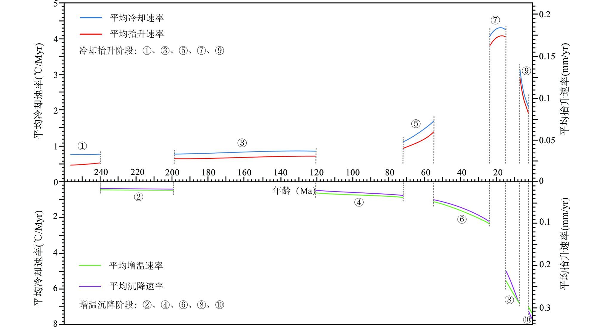 图 8 塘古兹巴斯坳陷中-新生代平均冷却(抬升)速率、平均增温(沉降)速率轨迹 Fig. 8 The trace of average cooling(uplifting)rate and warming(subsiding)rate of the Meso-Cenozoic in the Tangguzibas Depression,Tarim basin |